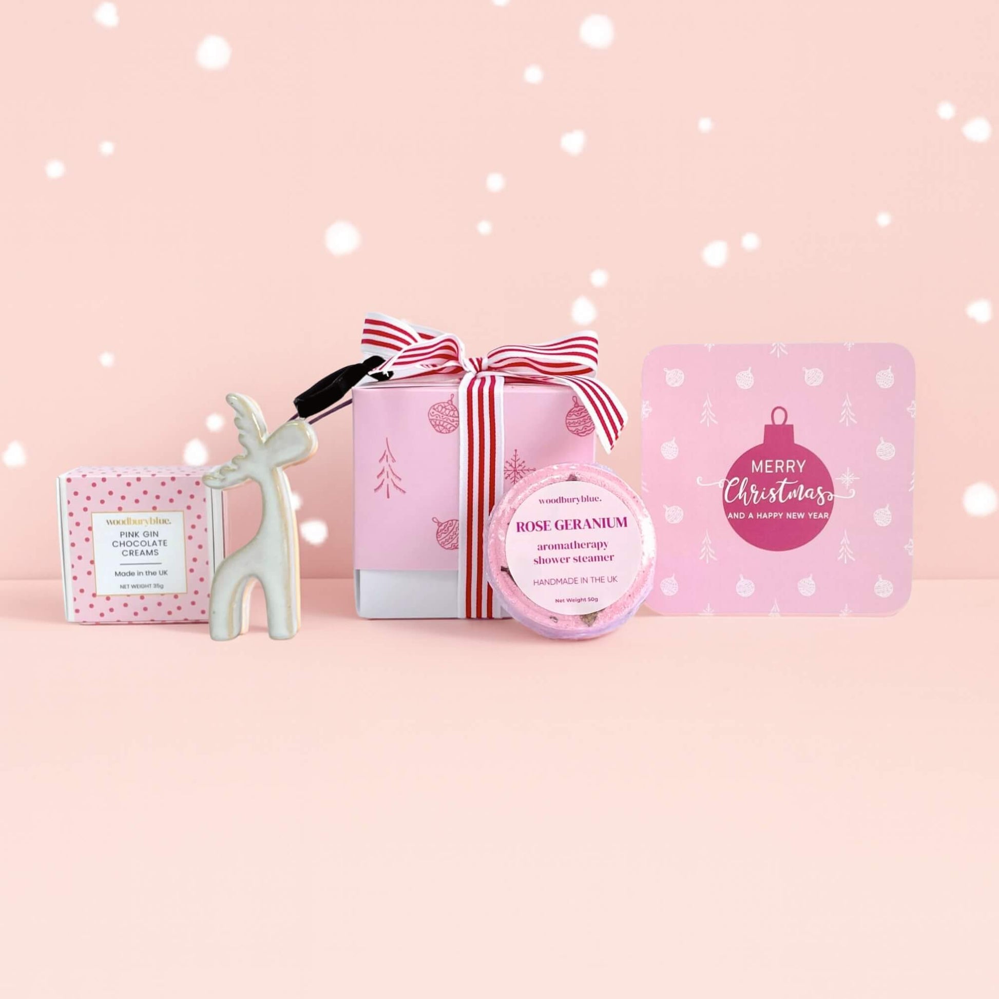 Inside, they’ll discover a Rose Geranium aromatherapy shower steamer to help them unwind, a box of Pink Gin Chocolate Creams handmade in the UK, and a ceramic mini reindeer ornament to bring a little magic to their tree. All tucked inside a limited-edition pink cube box, tied with a striped ribbon and ready to delight.